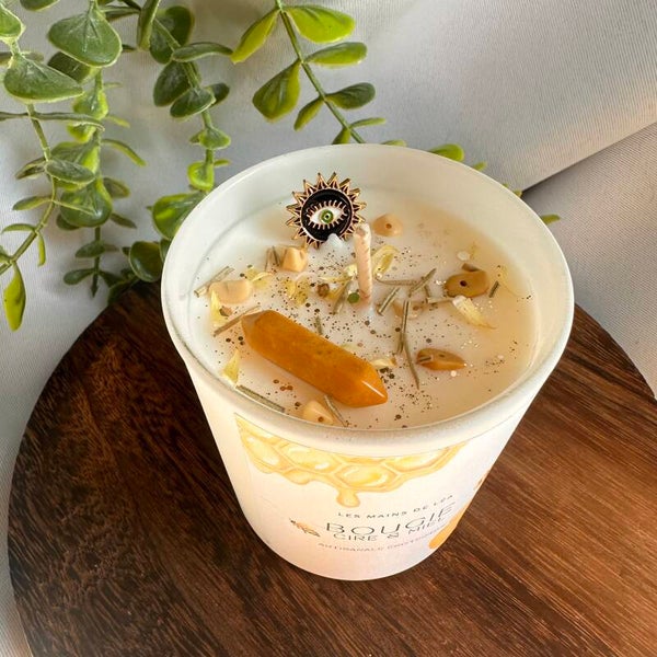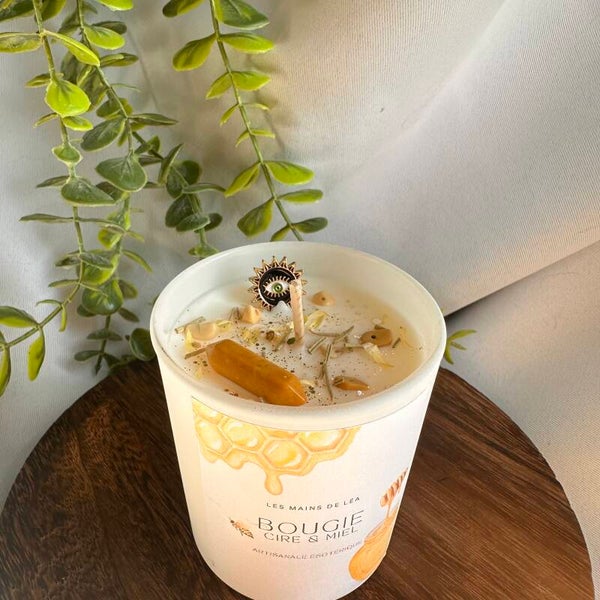 Offrez à votre intérieur une ambiance chaleureuse et enveloppante avec la bougie Protection de Nazar, parfumée à la senteur Cire et Miel. Fabriquée avec soin, cette bougie allie senteurs naturelles, cire de soja et décorations artisanales pour une expérience sensorielle unique.