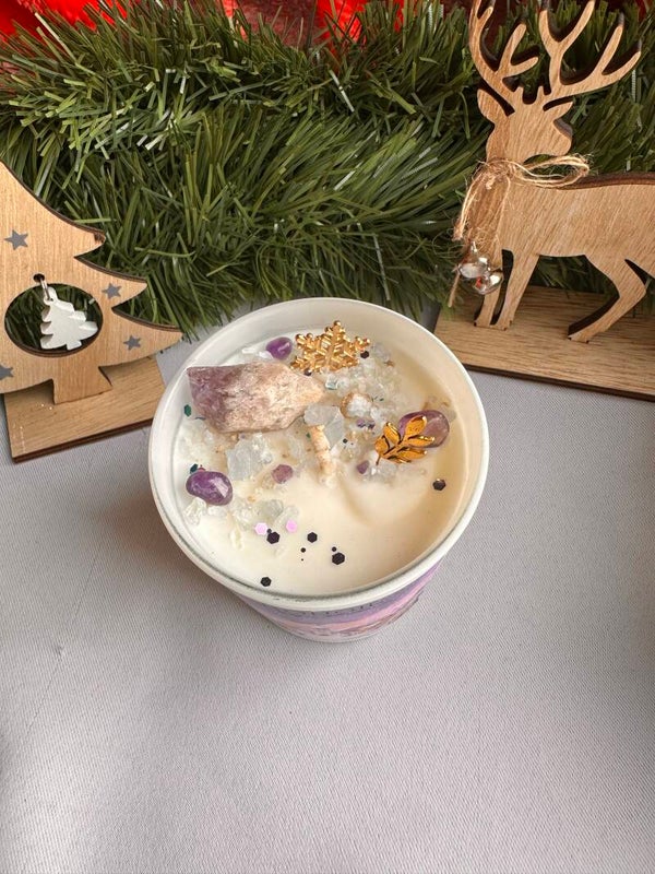 - Décorations : pierres naturelles (améthyste brute, célestine), flocons de neige & paillettes biodégradables ✨