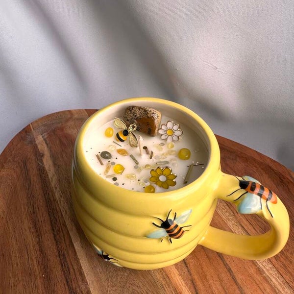 Succombez au charme de cette bougie gourmande et lumineuse, coulée dans une tasse originale inspirée du pot de miel. Une création chaleureuse qui évoque l’abondance, la douceur et les belles énergies du quotidien.