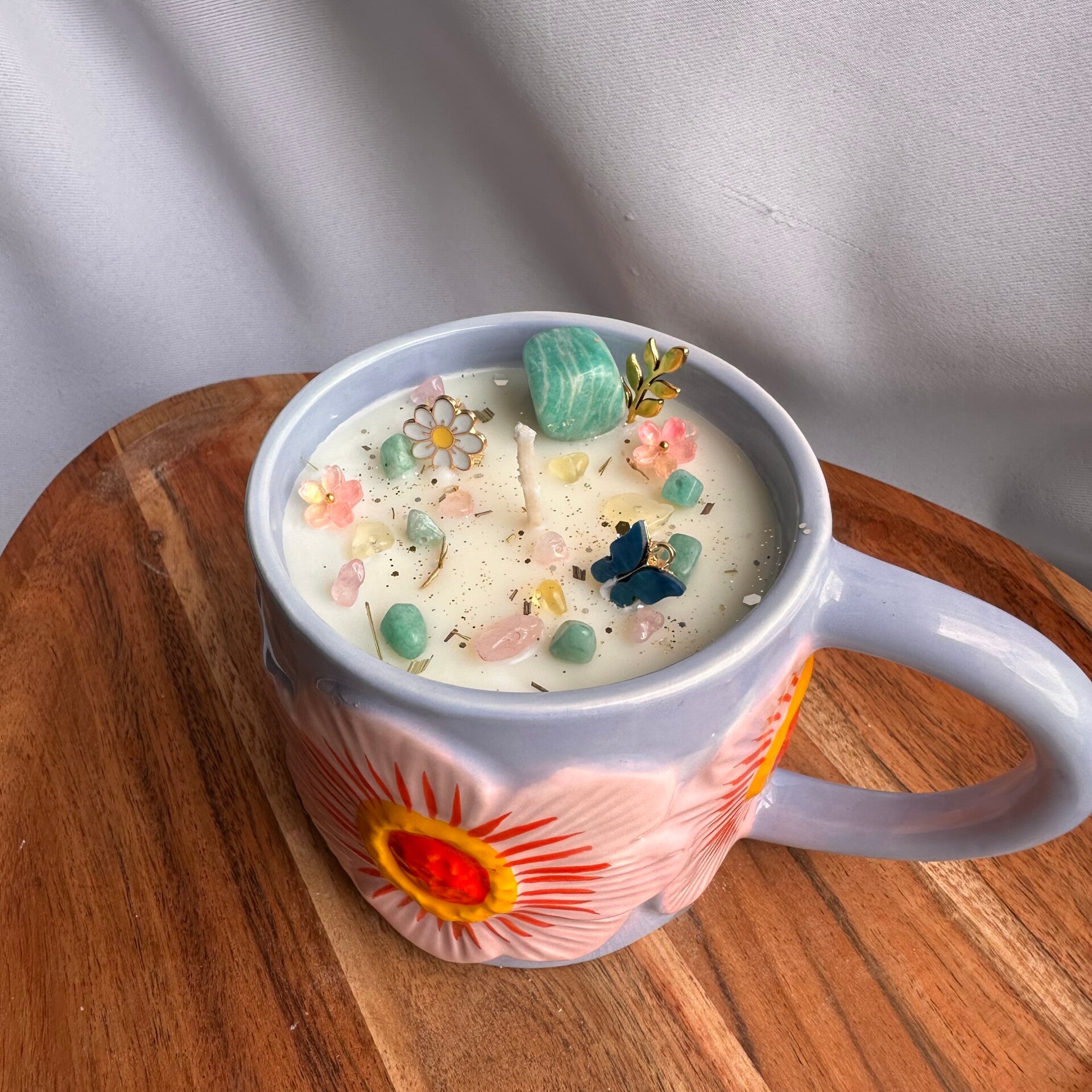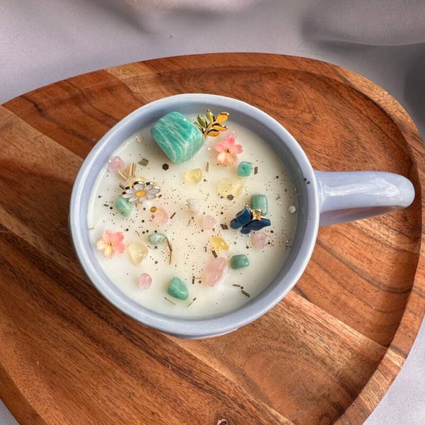 Décorée d’amazonite, quartz rose, citrine et délicats papillons floraux.