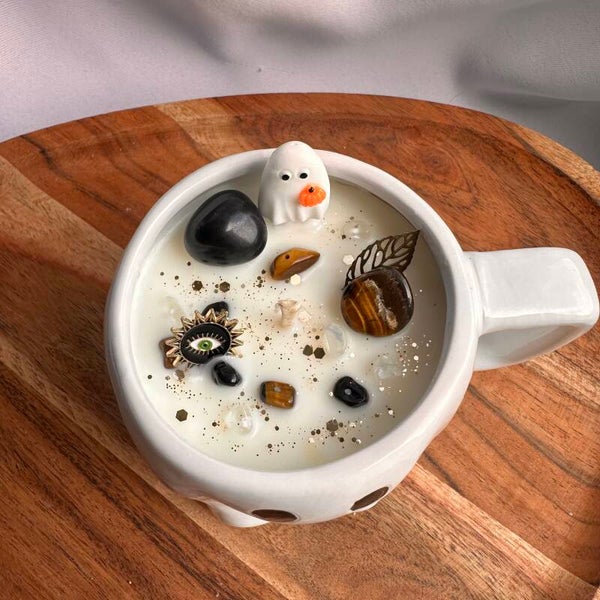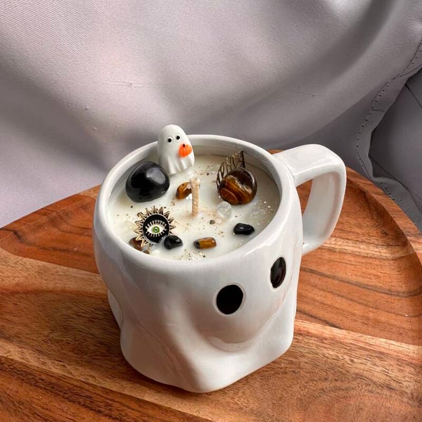 Une bougie originale dans une tasse fantôme pleine de caractère. Idéale pour les personnes souhaitant se recentrer et se protéger des énergies pesantes.